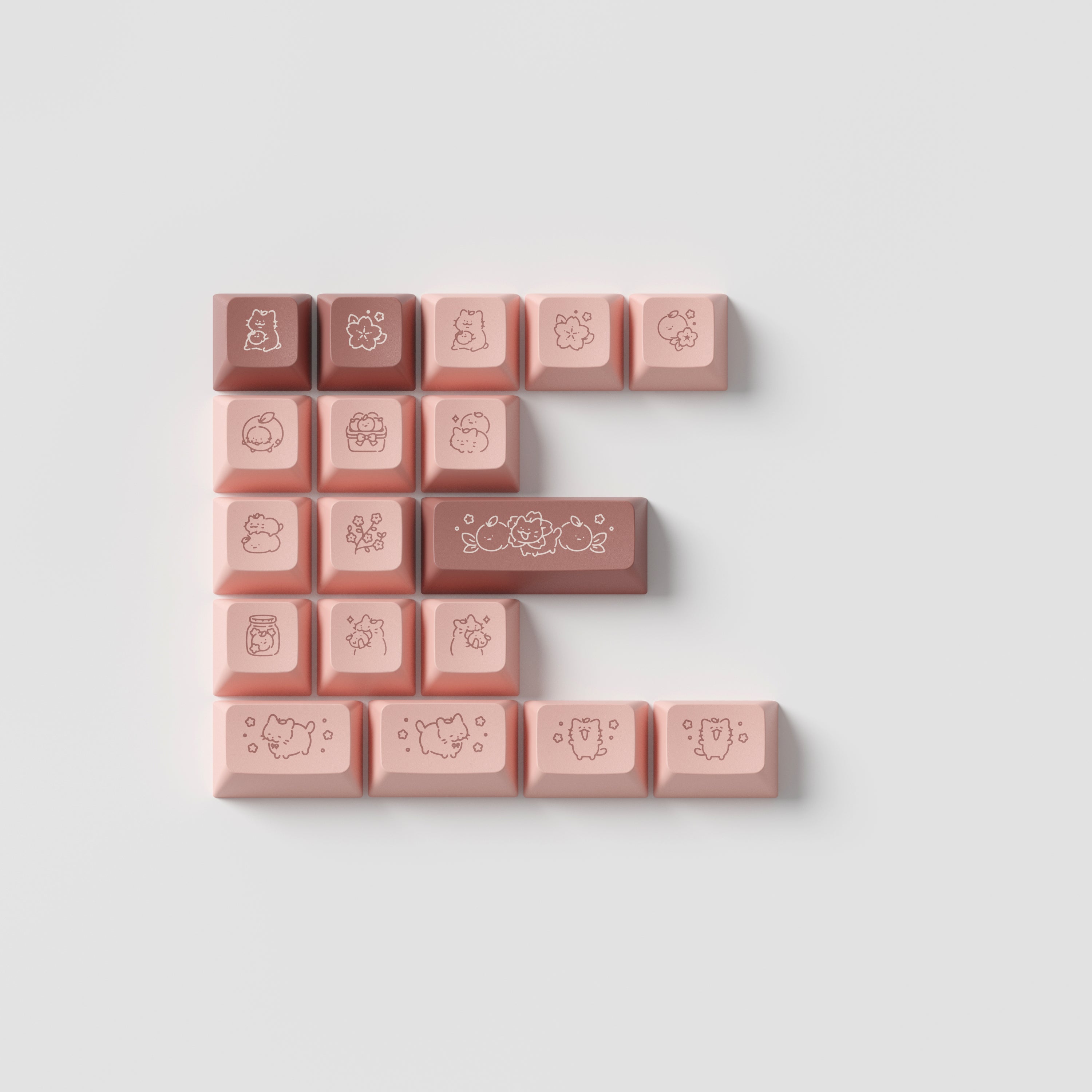 Deze keycapset, geïnspireerd op Momo Neko, geeft je een kijkje in de wereld van Shirouu en toont haar zelfontworpen personage. Momo Neko is een speels, charmant en ondeugend schattig roze katje dat dol is op perziken.